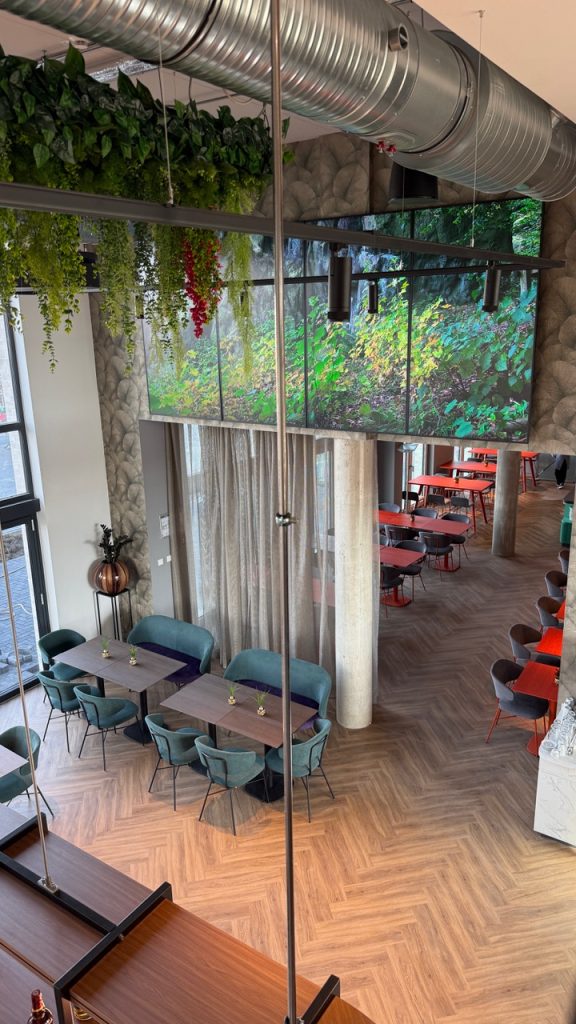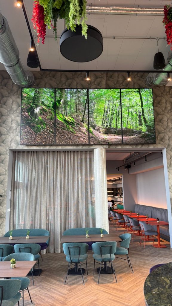 Vier 86″ Displays, die in beeindruckenden 4 Metern Höhe positioniert wurden. Diese außergewöhnliche Platzierung sorgt nicht nur für maximale Sichtbarkeit, sondern schafft auch eine starke visuelle Präsenz im Raum.